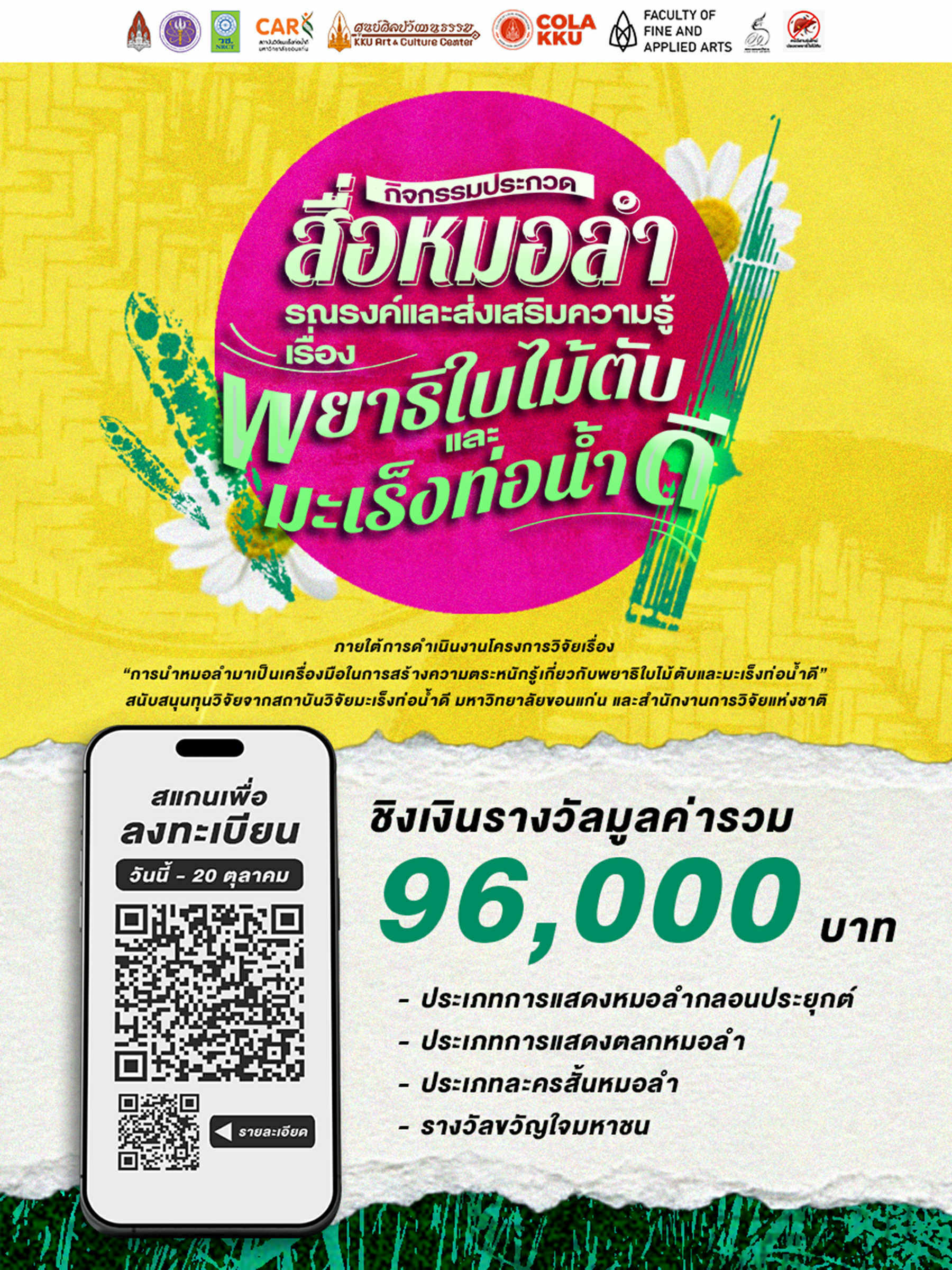 🎶 มื้อนี่แม่นมื้อดี ข่อยมีกิจกรรมดี ๆ มาฝาก 🎤 เชิญชวนพี่น้องนิสิต นักศึกษา และประชาชนทั่วไปร่วมส่งผลงานเข้าประกวด “สื่อหมอลำรณรงค์และส่งเสริมความรู้เรื่องพยาธิใบไม้ตับและมะเร็งท่อน้ำดี”ภายใต้โครงการวิจัย “การนำหมอลำมาเป็นเครื่องมือในการสร้างความตระหนักรู้เกี่ยวกับพยาธิใบไม้ตับและมะเร็งท่อน้ำดี”สนับสนุนทุนวิจัยจาก สถาบันวิจัยมะเร็งท่อน้ำดี มหาวิทยาลัยขอนแก่นและ สำนักงานการวิจัยแห่งชาติ (วช.) 💰 ชิงเงินรางวัลรวมมูลค่ากว่า 96,000 บาท พร้อมถ้วยรางวัลเกียรติยศเปิดรับผลงานการประกวด 3 ประเภท ได้แก่1️⃣ การแสดงหมอลำกลอนประยุกต์2️⃣ ตลกหมอลำ3️⃣ ละครสั้นหมอลำ 🎭 รายละเอียดการประกวด 🔸 ประเภทการแสดงหมอลำกลอนประยุกต์ 📎 สิ่งที่ต้องส่ง คลิปวิดีโอตัวอย่างการแสดงหมอลำกลอนประยุกต์ (ความยาวไม่เกิน 5 นาที) เอกสารอธิบายแรงบันดาลใจ แนวคิด และเนื้อหาที่เกี่ยวข้องกับ“การรณรงค์และส่งเสริมความรู้เรื่องพยาธิใบไม้ตับและมะเร็งท่อน้ำดี” (ไม่เกิน 1 หน้ากระดาษ A4) 🏆 รางวัลการประกวด (5 รางวัล) รางวัลชนะเลิศ 🥇 เงินรางวัล 10,000 บาท พร้อมถ้วยรางวัล รองชนะเลิศอันดับ 1 … Read more